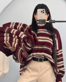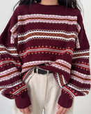 با این بافت زرشکی با طرحهای هندسی کلاسیک، استایل زمستانیات رو گرم، شاد و خاص کن. ترکیب رنگهای سفید، قهوهای و مشکی در نوارهای افقی، حس نوستالژیک و فصلی به لباس میده و برای روزهای سرد پاییز و زمستان انتخابی ایدهآل محسوب میشه.
