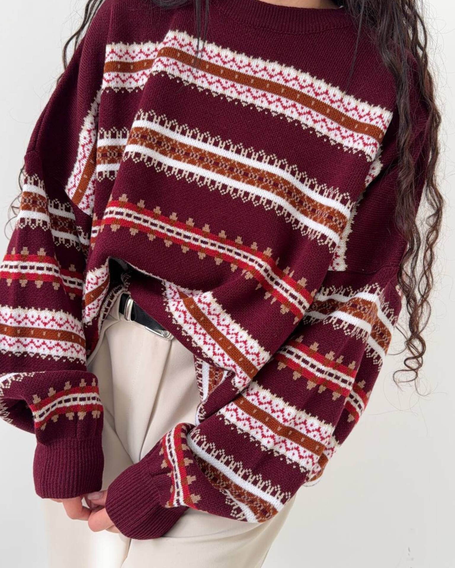 با این بافت زرشکی با طرحهای هندسی کلاسیک، استایل زمستانیات رو گرم، شاد و خاص کن. ترکیب رنگهای سفید، قهوهای و مشکی در نوارهای افقی، حس نوستالژیک و فصلی به لباس میده و برای روزهای سرد پاییز و زمستان انتخابی ایدهآل محسوب میشه.